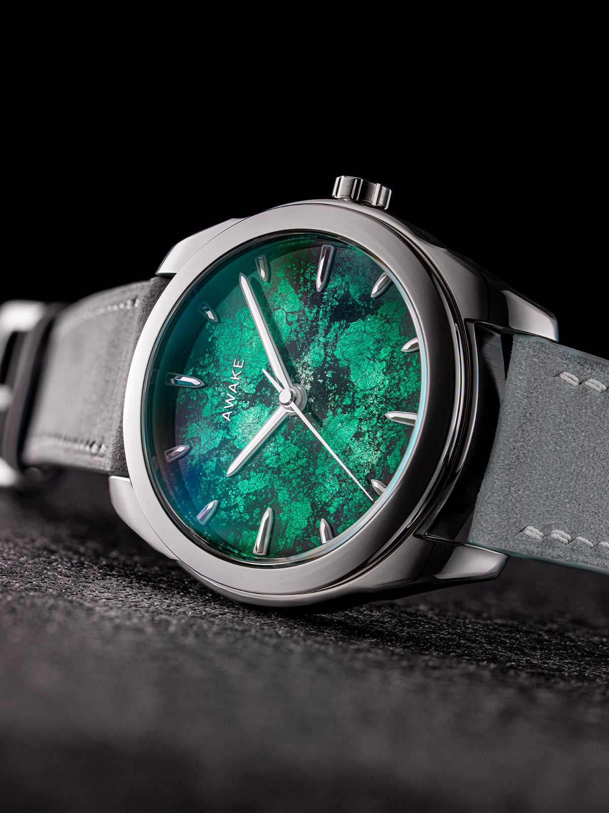 Each dial we create is absolutely unique, both in its technique—mastered exclusively by Awake—and in the artisan's hand that shaped it.