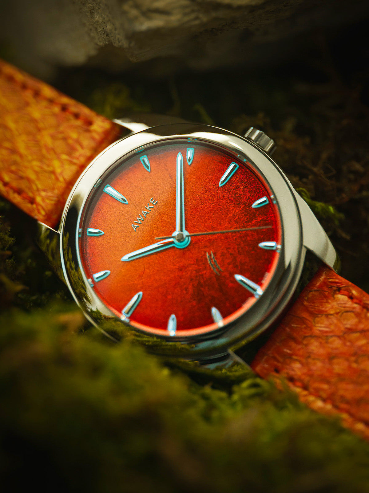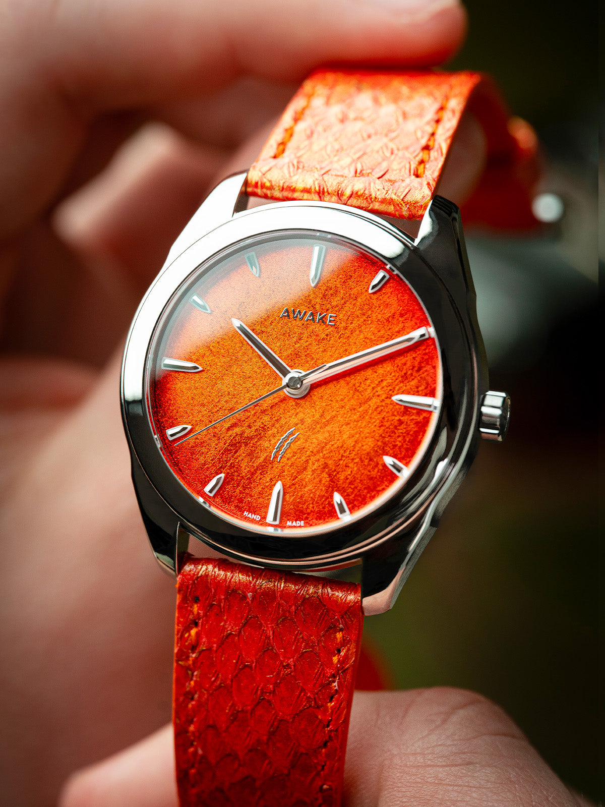 To bring texture and depth to our dials, we have chosen, following Vietnamese tradition, to integrate pure silver leaves onto the base of our dials, before applying the Sơn Mài lacquer. A complex and delicate method, giving AWAKE watches a deep, unique, and striking visual effect.