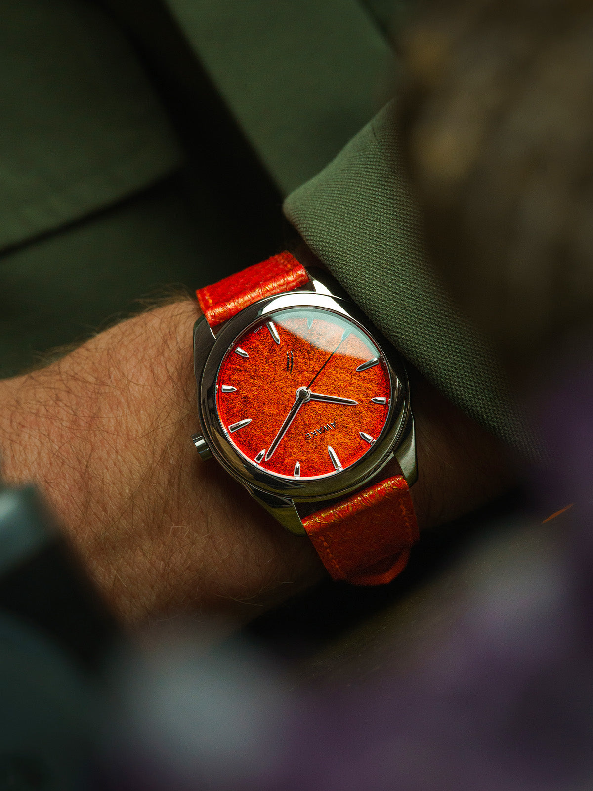 The T-REX version is combined with a bright iridescent orange marine leather strap with a reptilian appearance, lined with orange calfskin featuring tone-on-tone hand stitching.