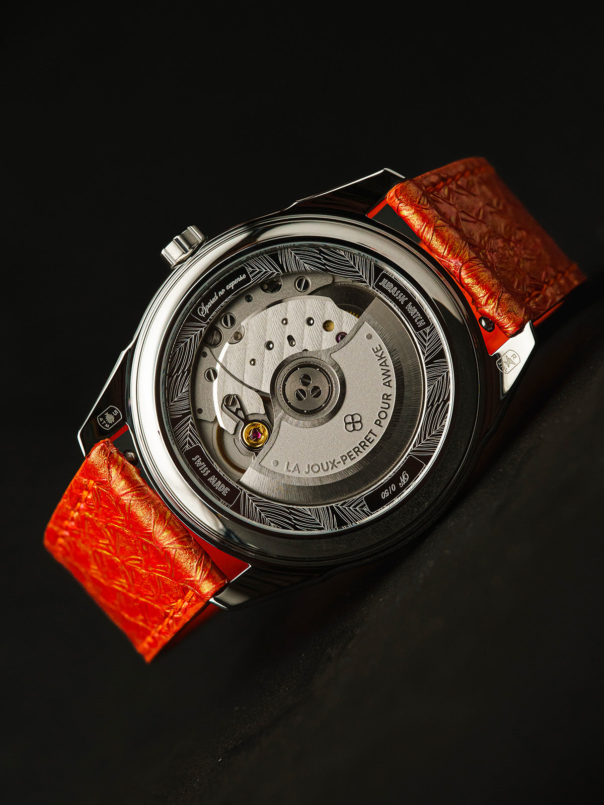 Renowned for its reliability and impressive 68-hour power reserve, our La Joux-Perret G101 caliber stands out with a custom-designed tungsten rotor, crafted exclusively for AWAKE. This rotor features elegant contrasts of raised and recessed surfaces, enhanced by refined finishing techniques, creating a striking visual effect.