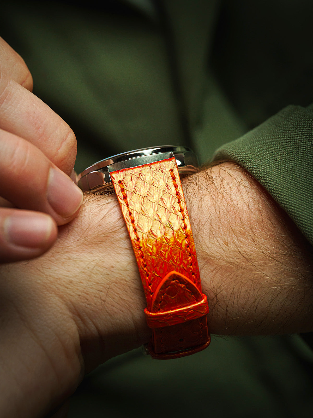 Scaled salmon leather by ICTYOS: deep green / bright orange / iridescent marron glacé, calfskin lining and tone-on-tone hand-stitching. Recycled 316L stainless steel pin buckle.