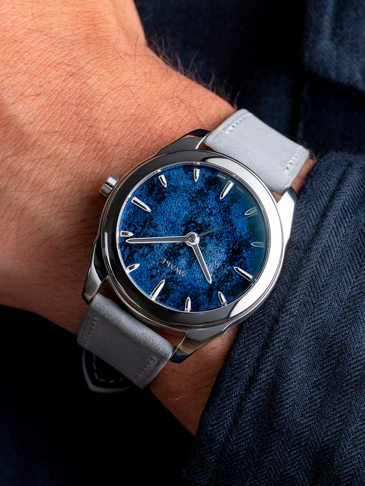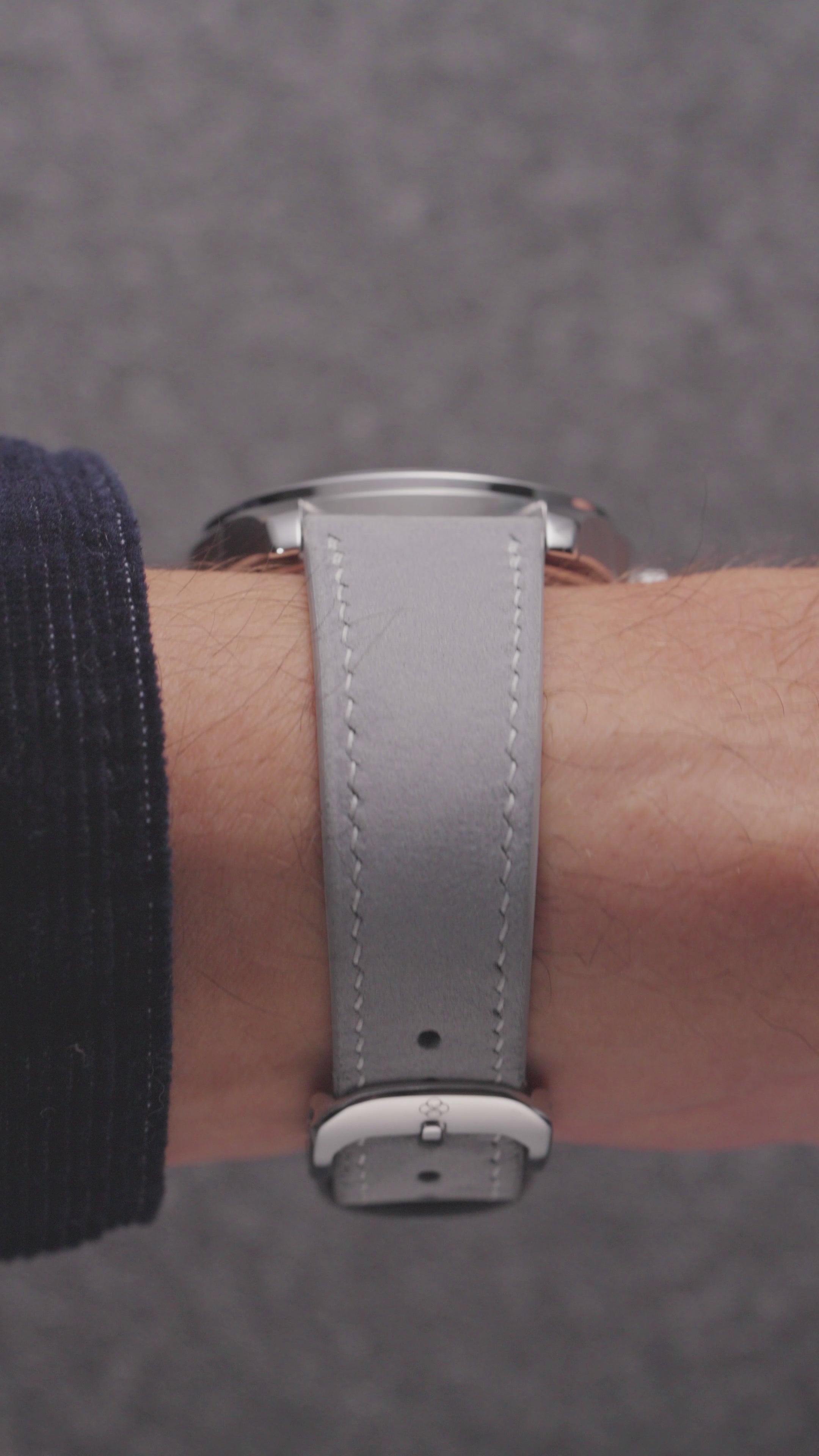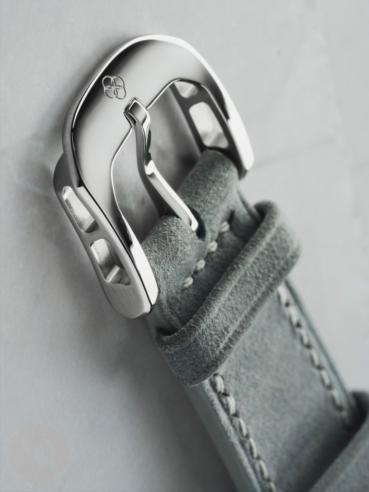 For this collaboration, we selected a 20x16mm light gray Nubuck leather strap with a soft, luxurious texture, lined in black rubber for enhanced comfort and flexibility. Tone-on-tone topstitching, a 316L recycled steel pin buckle, and presto spring bars complete the ensemble—an elegant and durable bracelet that complements each dial in this new collection to perfection.