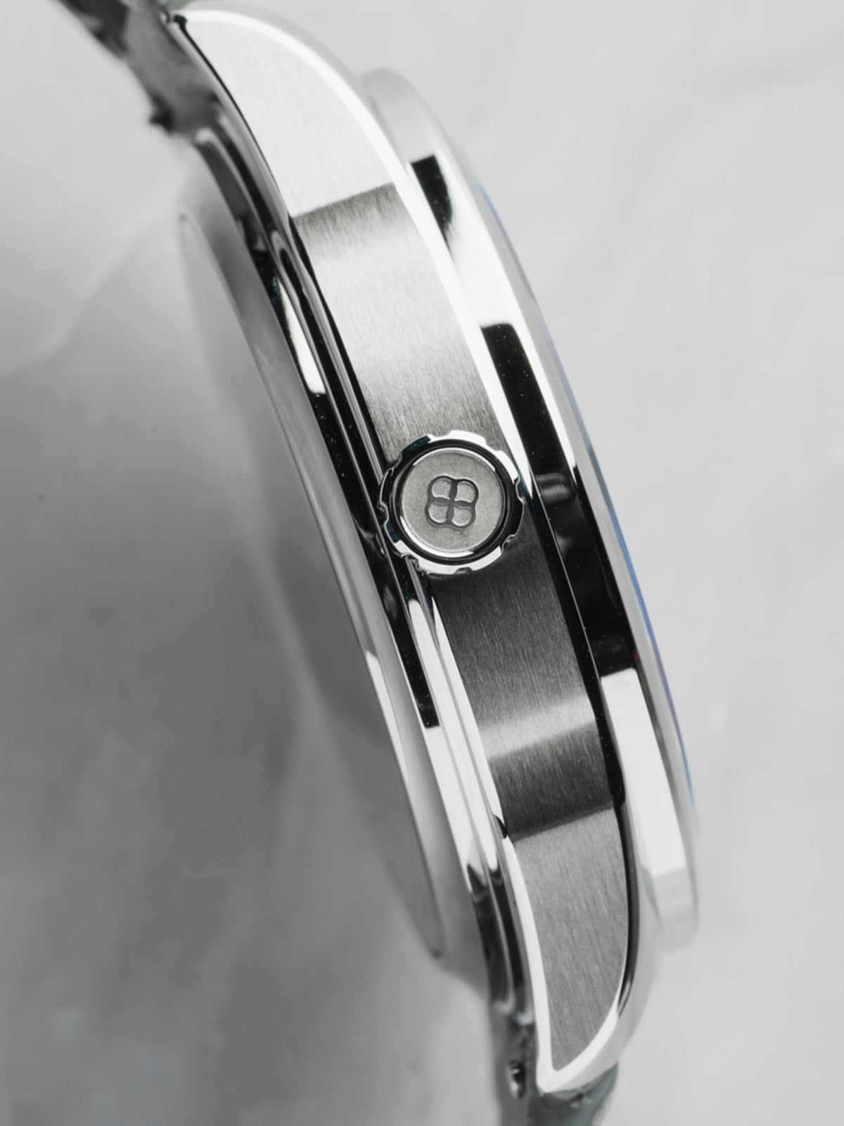 Encircling the movement is a textured “Clous de Paris” ring, protected by sapphire crystal. Our signature water-resistance hallmark (the fish) and recycled 316L steel hallmark (the anvil) are subtly engraved within the lugs, adding a playful and original touch.