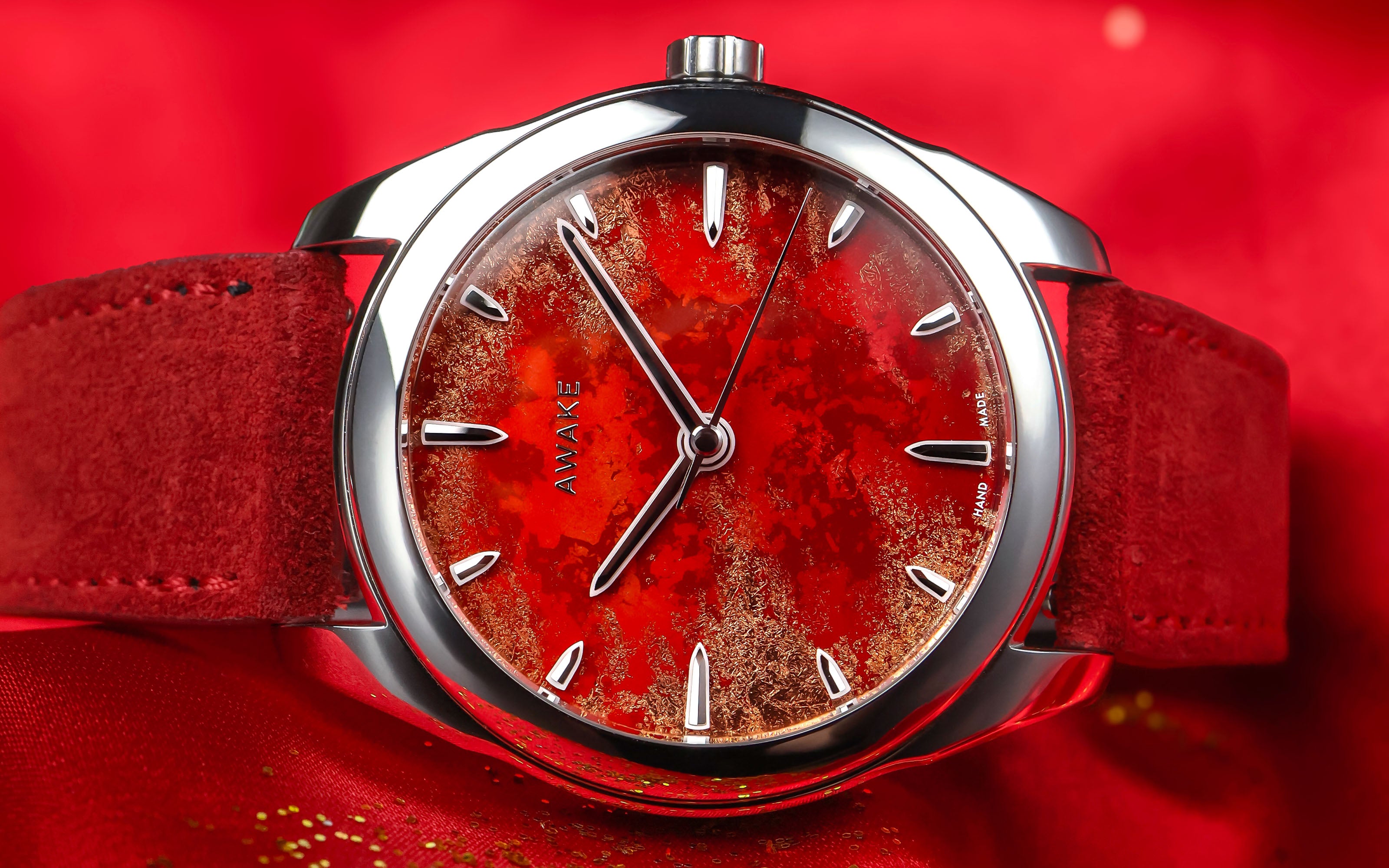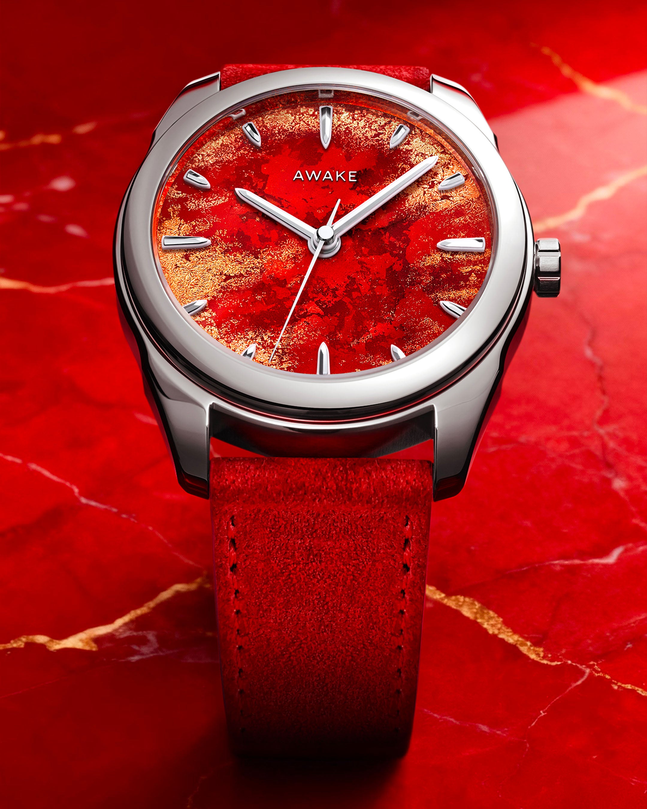 Royal Red is powered by the La Joux-Perret G101 automatic movement, renowned for its reliability, precision, and 68-hour power reserve. Our movement is elevated by an exclusive tungsten rotor, specially designed for AWAKE, featuring contrasts of polished, brushed, and micro-beaded surfaces. The whole is encircled by a ring engraved with the edition’s specifications and the brand’s motto: Artisanship, Awakened.