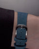 Blue suede with rubberized calf lining, tone-on-tone stitching, mounted on a pin buckle. Strap size: 115x70 - 20-16mm