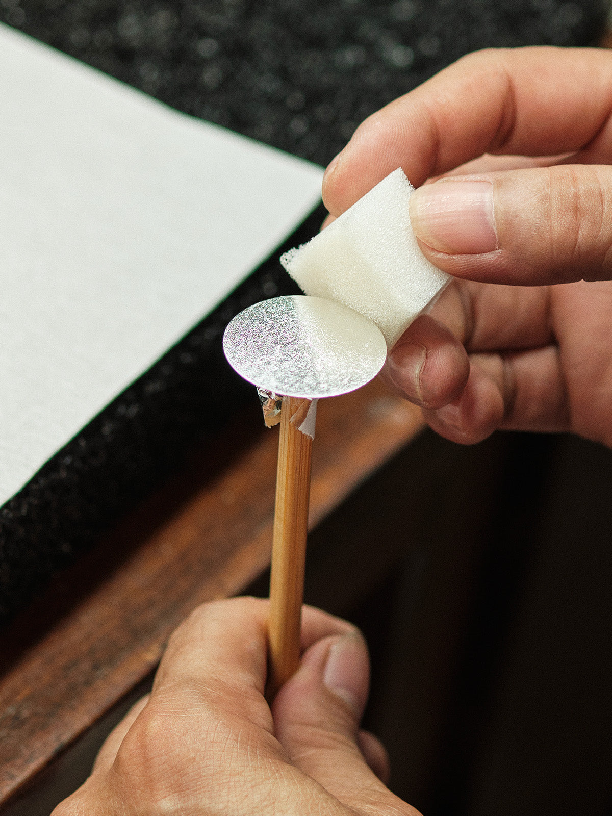Once the silver leaf is applied, natural pigments are sprayed onto the dial to give it its color and contrasts. Then a dozen successive layers of lacquer are applied and polished one by one, providing shine, protection, and almost infinite visual depth.